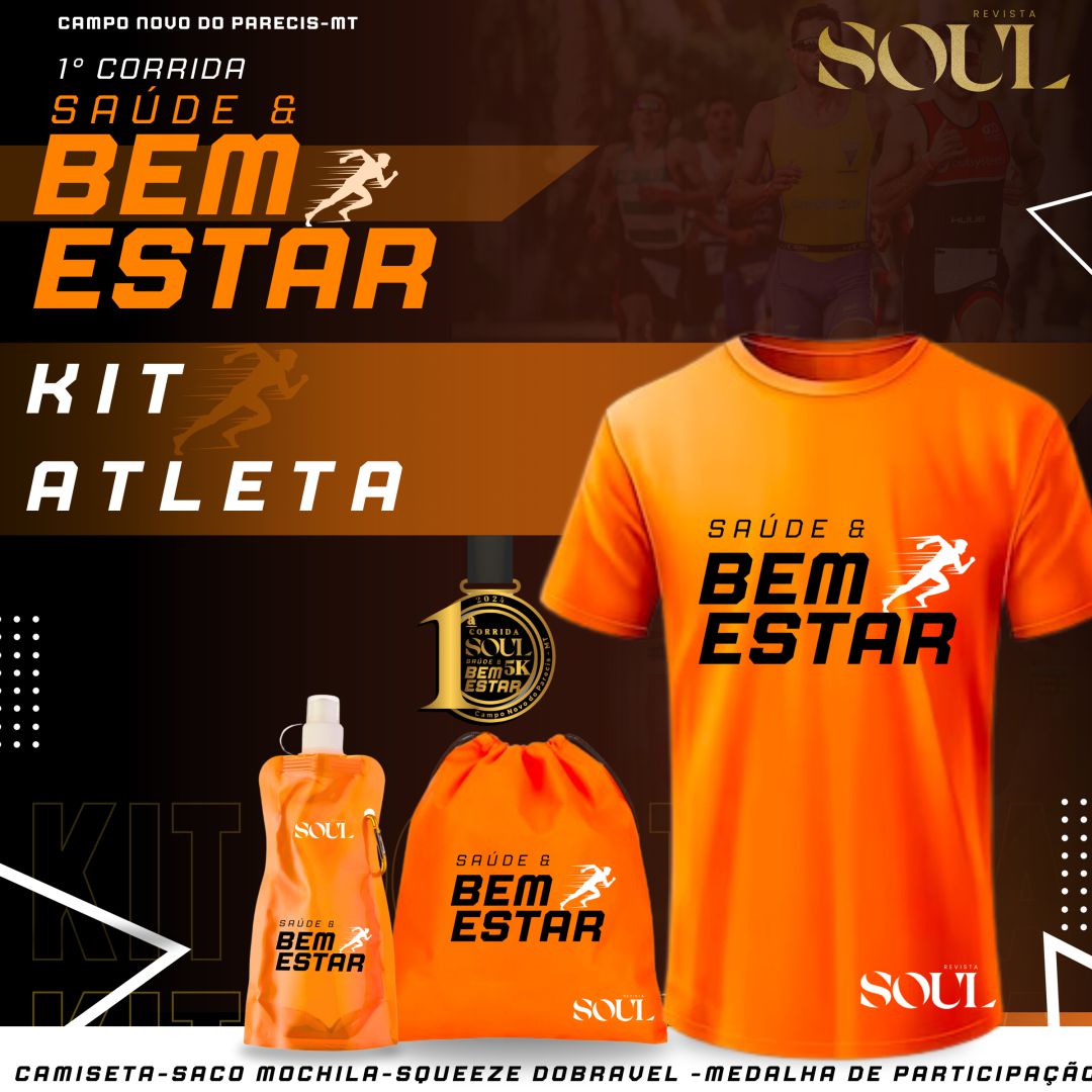 Artigo 21º.O KIT de corrida será composto por um número de peito, camiseta, chip, squeeze dobrável e mochila saco e medalha (pós prova).