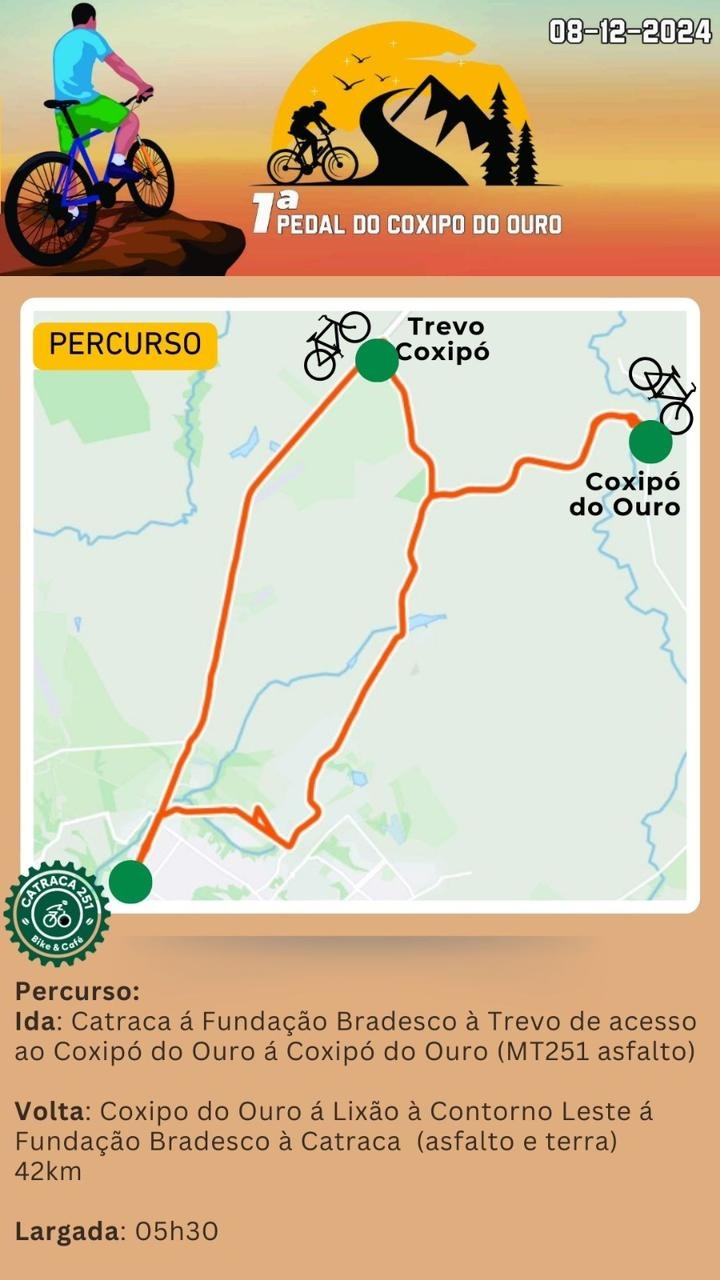 2.2. O evento será realizado no dia 08 de dezembro de 2024, com largada prevista para às 5h30, na Av. B do Bairro PQ das Nações, em frente a CAFETERIA CATRACA 251, município de Cuiabá, sendo ida e volta a comunidade Coxipó do Ouro, com um percurso de aproximada de 46km.