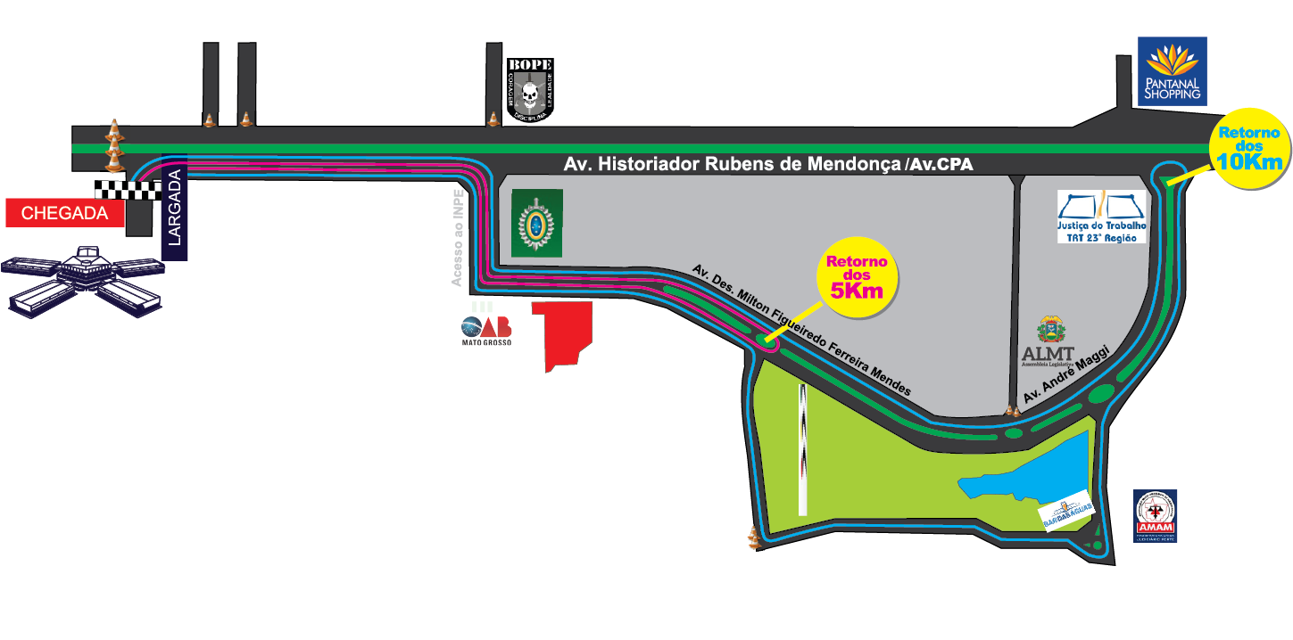 7.1 A largada da corrida dar-se-á em frente ao Quartel do Comando Geral da Polícia Militar, situado na Avenida Historiador Rubens de Mendonça, nº. 6.135, Bairro Novo Paraíso I - Cuiabá/MT, com chegada no mesmo local, junto ao pórtico de entrada do QCG, conforme croqui;
