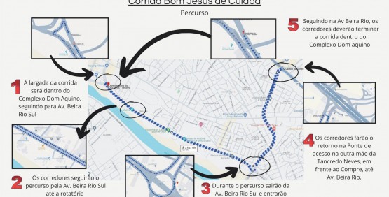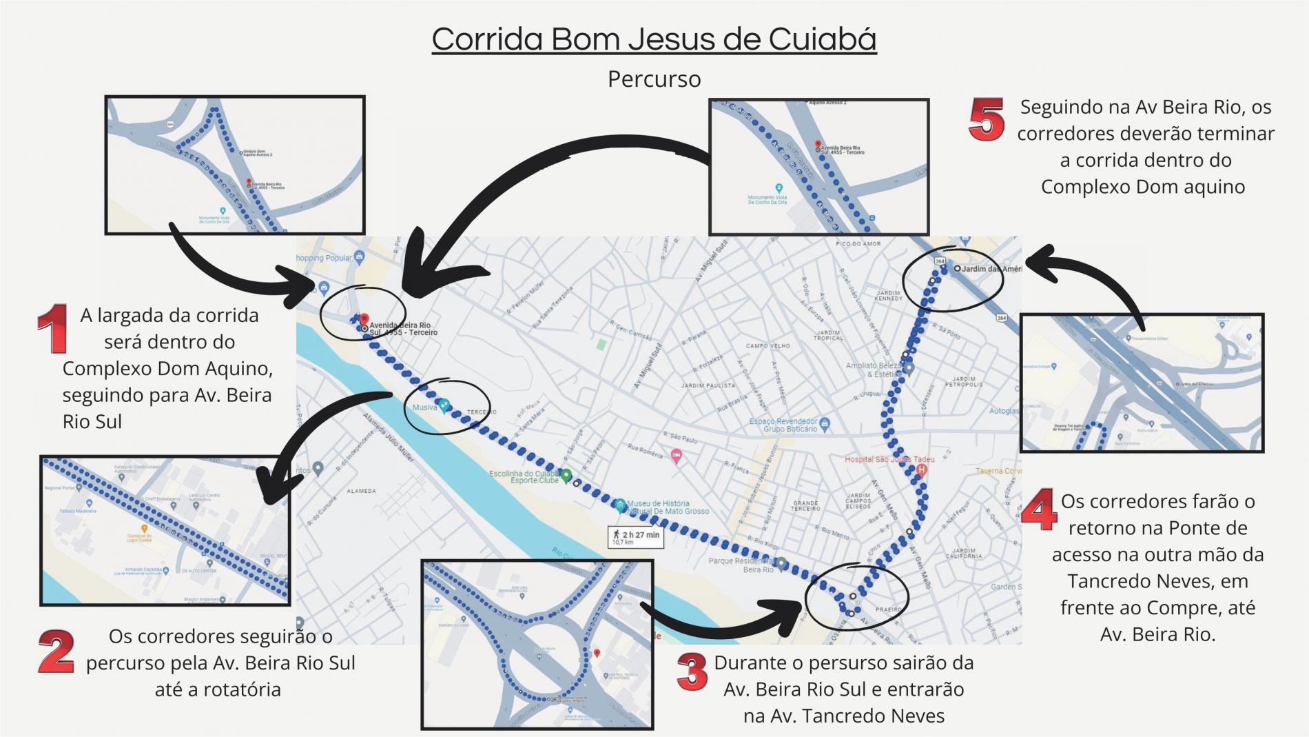 O trajeto de 10 quilômetros da corrida, terá a largada às 6h20min da manhã, na pista de atletismo do Complexo Esportivo do Dom Aquino, saindo da pista pelo portão da beira rio, faz um retorno, seguira na av. Beira rio sentido Coxipó, na mão da direita, até o viaduto Murilo Domingos, contornando a rotatória a esquerda e entrada na av. Tancredo Neves (córrego do Barbado) na mão da direita, seguindo até o viaduto Clovis Roberto, contornando a rotatória a esquerda da av. Fernando Correa da Costa, voltando na mão esquerda av. Tancredo Neves (córrego do Barbado) sentido av. Beira Rio, chegando viaduto Murilo Domingos virando a direita na av. Beira Rio sentido Complexo Esportivo do Dom Aquino, acessando o complexo pelo portão que dará acesso a pista de atletismo do complexo.