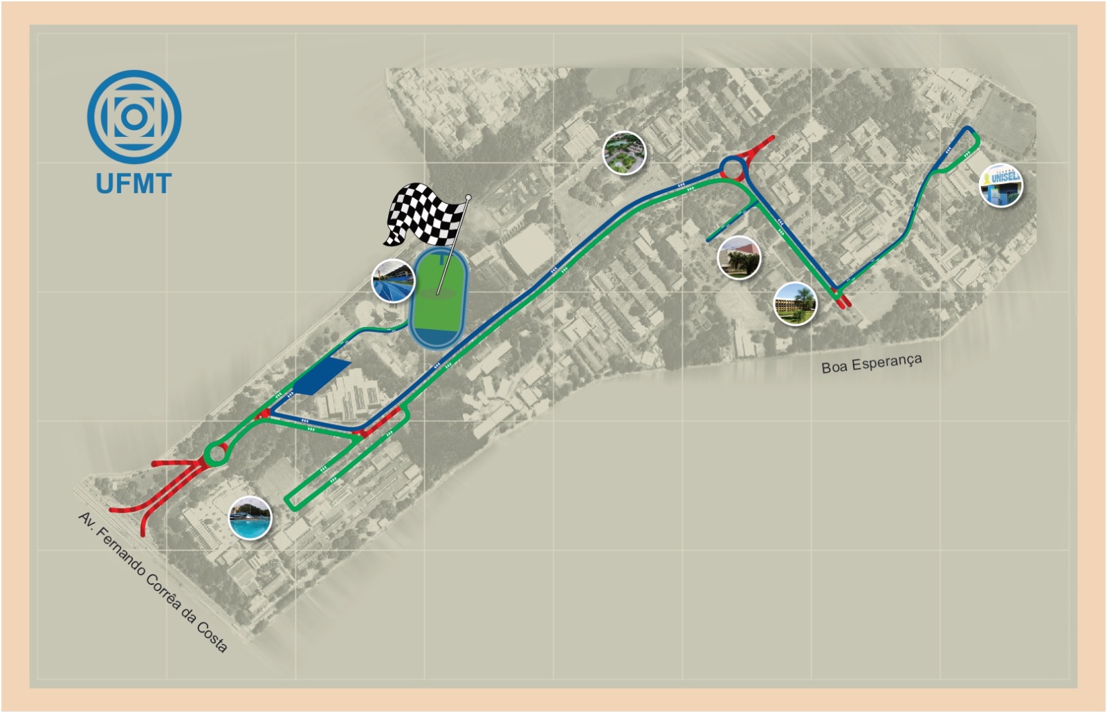 4.3. O percurso será inteiramente sinalizado pela organização sendo a largada e a chegada na pista do Centro Oficial de Treinamento (COT) – Campus UFMT Cuiabá. O uso de atalhos é proibido.