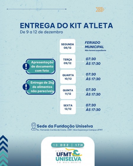 9.1 A entrega dos kits será realizada no período de 08 a 12 de dezembro de 2025, das 7h30 às 17h30, na sede da Fundação Uniselva – Campus UFMT. Informações adicionais serão divulgadas nas redes sociais e no site oficial da Fundação Uniselva.