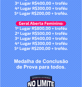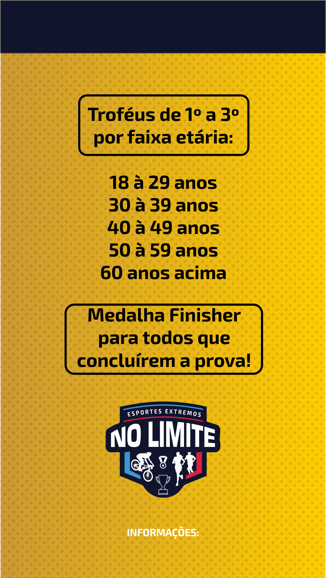 B. Os atletas 1º, 2º e 3º de cada faixa etária, masculino e feminino, ganham TROFÉU. O primeiro e a primeira colocada de cada faixa etária recebem 30% de desconto para a qualquer outro evento da No Limite Esportes Extremos.