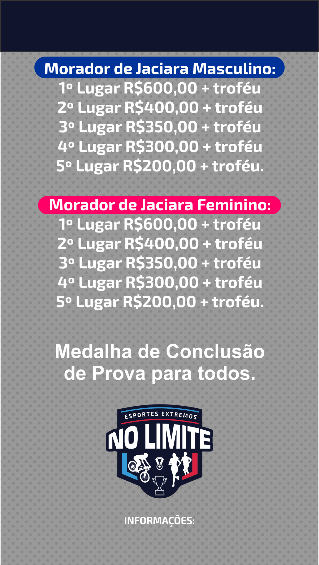 C. O atleta que se classifica para a premiação em dinheiro *ELITE, *GERAL E *MORADOR DE JACIARA, não recebe premiação por faixa etária.