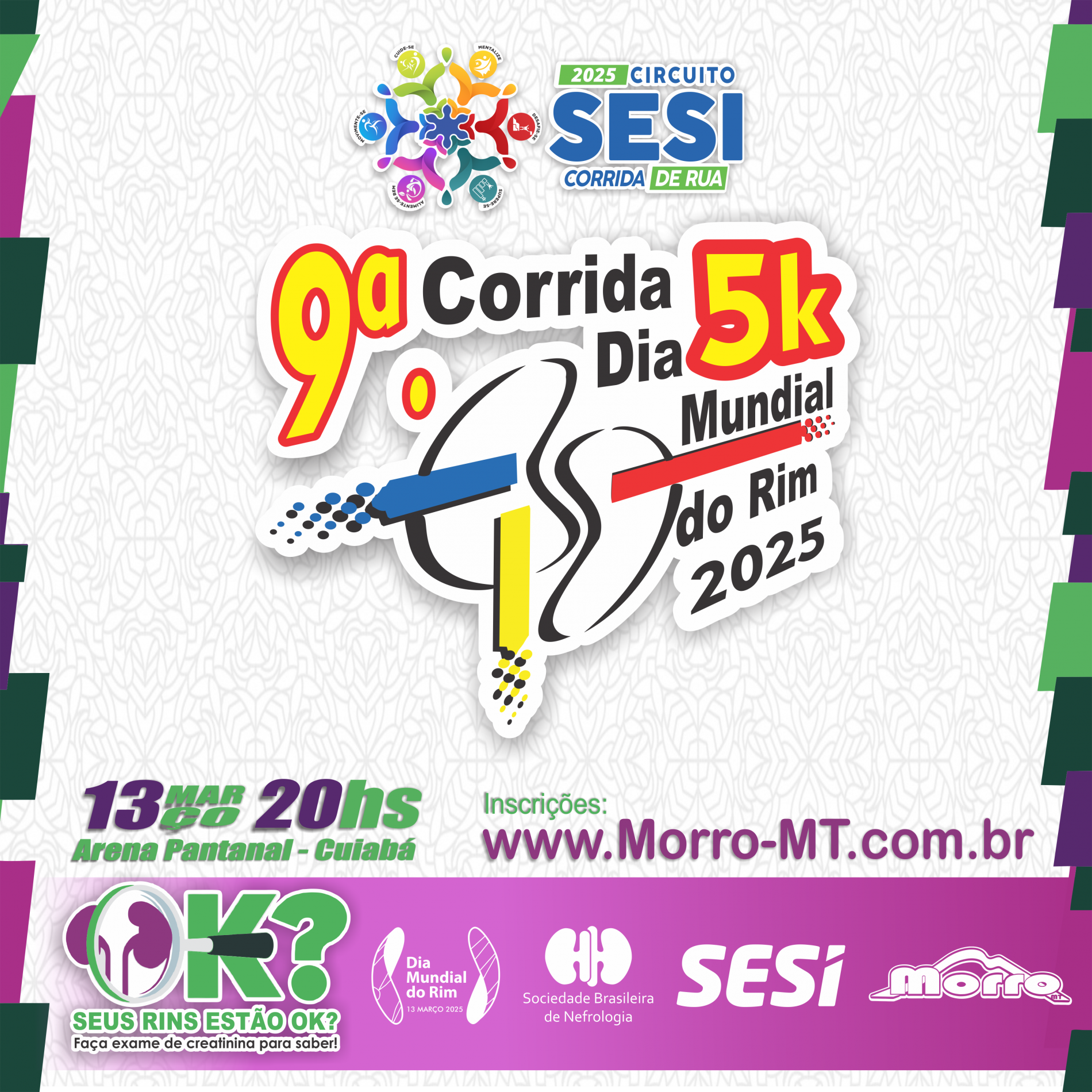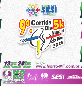 A 9ª Corrida do Dia Mundial do Rim - 2025 é uma iniciativa idealizada e realizada por Morro MT como parte das atividades alusivas à campanha do Dia Mundial do Rim. Neste ano, o evento conta com o apoio do SESI MT e integra o Circuito SESI de Corridas de Rua 2025, apresentando a etapa temática "Alimente-se Bem", que reforça a importância de hábitos alimentares saudáveis para a saúde renal e o bem-estar geral.